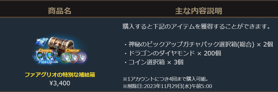「神秘のピックアップガチャパック選択箱(総合)」と一緒に選択したコインを定められた確率で一定の個数手に入れる事が可能な「コイン選択箱」や「ドラゴンのダイヤモンド」が獲得できるお得なパッケージです。