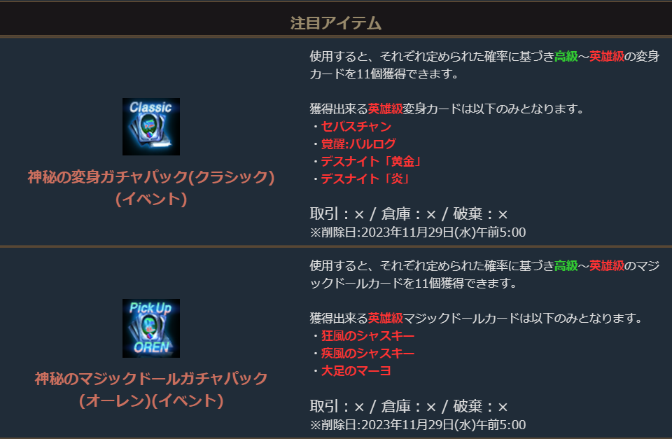 ※一部アイテムは未使用の場合、一定期間が経過すると自動で削除されます。詳しくは各アイテムの詳細をご確認ください。