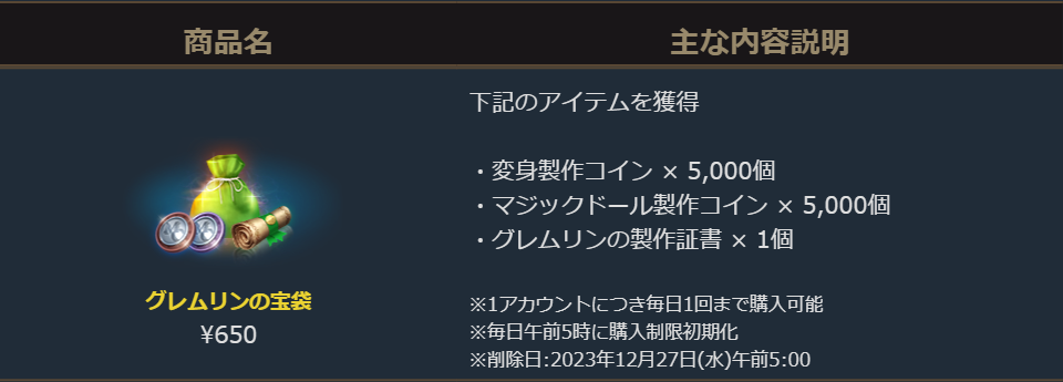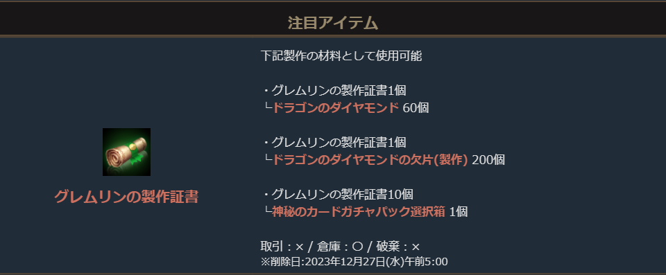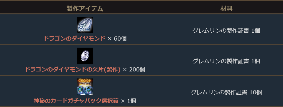 「変身製作コイン5000個」と「マジックドール製作コイン5000個」に加え、付属の「グレムリンの製作証書」を材料に「ドラゴンのダイヤモンドの欠片(製作)200個」や「ドラゴンのダイヤモンド60個」等の製作ができる、