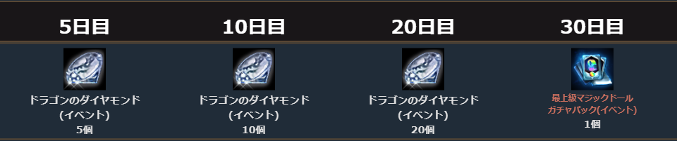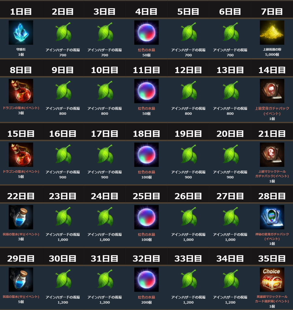 多くのアインハザードの祝福に加え、「守護石」や「上級祝福の粉」などが手に入るほか、連続出席報酬30日目には「最上級マジックドールガチャパック(イベント)」が獲得できます。