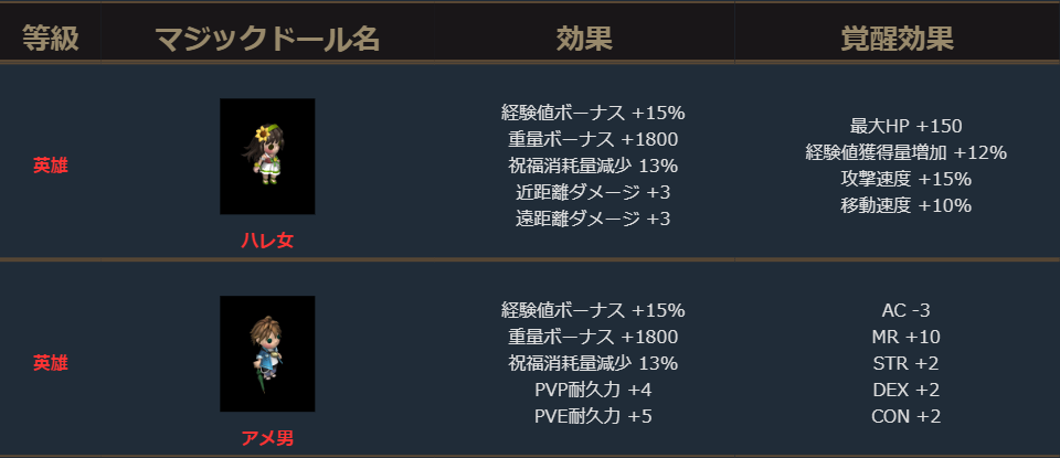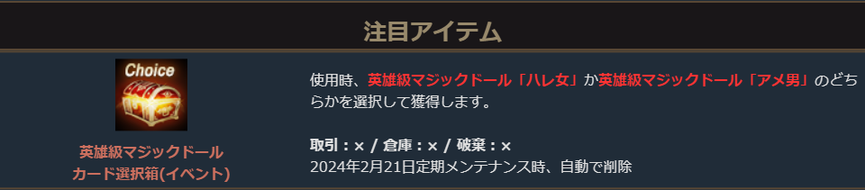 また、35日目の出席報酬には英雄級マジックドールカード選択箱(イベント)が獲得でき、マジックドールカード「ハレ女」と「アメ男」のどちらかを選択して獲得可能です。