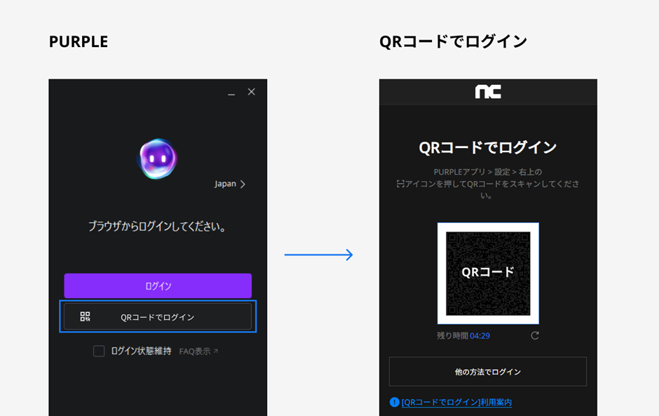 「QRコード」によるログイン認証は、PC PURPLEのログイン画面に表示されるQRコードを、モバイル端末のモバイル PURPLEでスキャンしてログインを承認し、