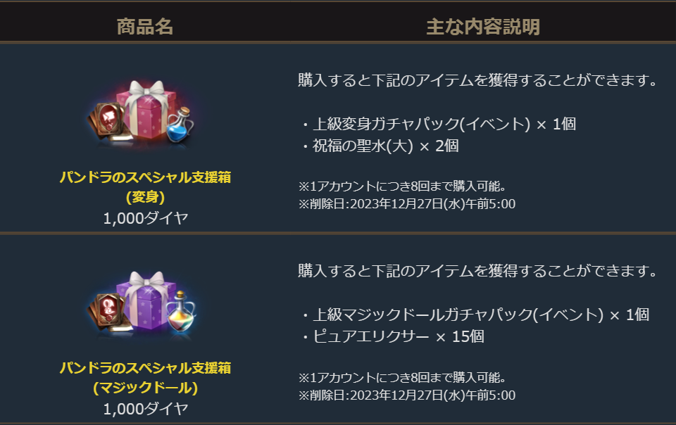 「上級マジックドールガチャパック(イベント)」と「ピュアエリクサー15個」が獲得できる「パンドラのスペシャル支援箱(マジックドール)」の2つのパッケージが登場しました。