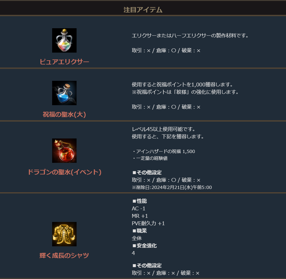 ※一部アイテムは未使用の場合、一定期間が経過すると自動で削除されます。詳しくは各アイテムの詳細をご確認ください。