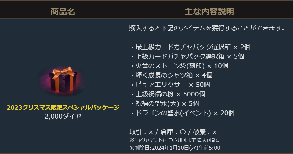 「最上級カードガチャパック選択箱」と「上級カードガチャパック選択箱」に加え、「ピュアエリクサー」、「祝福の聖水(大)」、「ドラゴンの聖水(イベント)」、「輝く成長のシャツ箱」など、