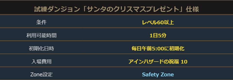 試練ダンジョン「サンタのクリスマスプレゼント」の入場条件は以下となります。