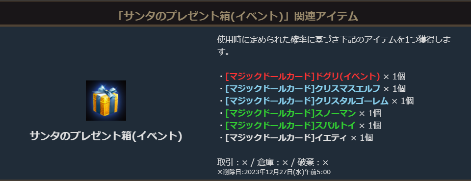 「サンタのプレゼント箱(イベント)」からはマジックドールカードが獲得できますので、是非挑戦してください。