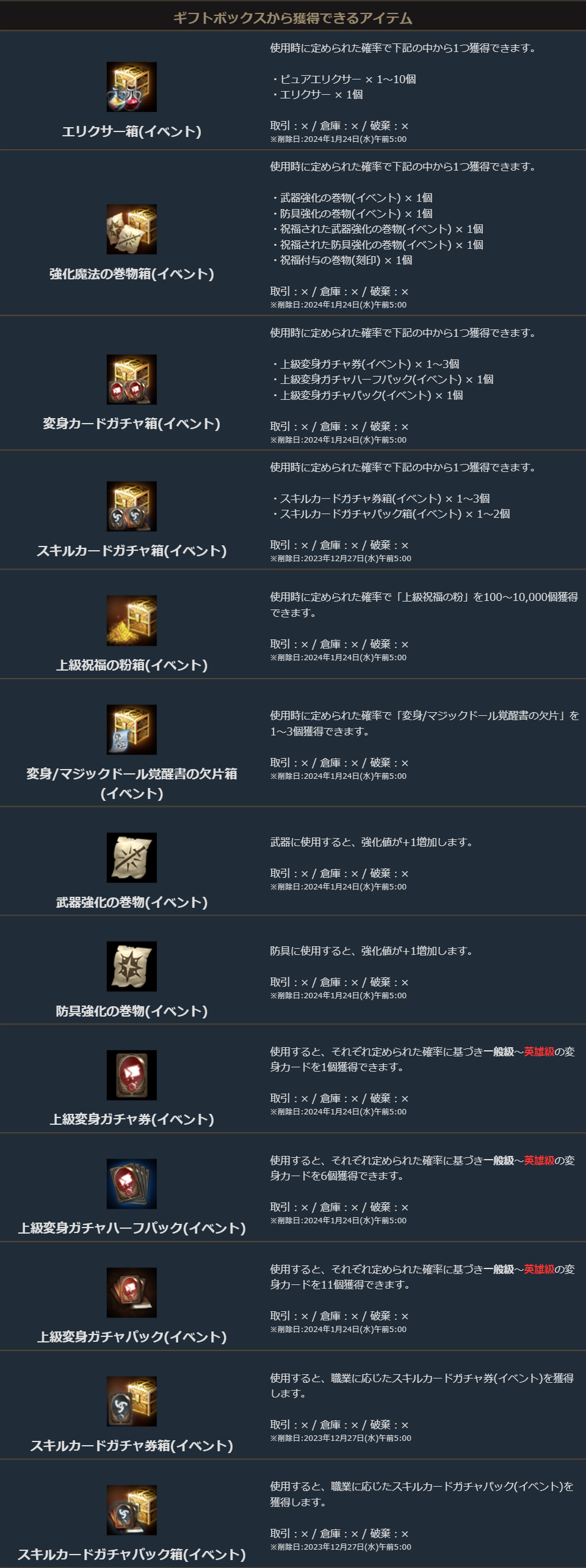 ダンジョン内では「エリクサー箱(イベント)」や「変身/マジックドール覚醒書の欠片箱(イベント)」等が獲得できます。