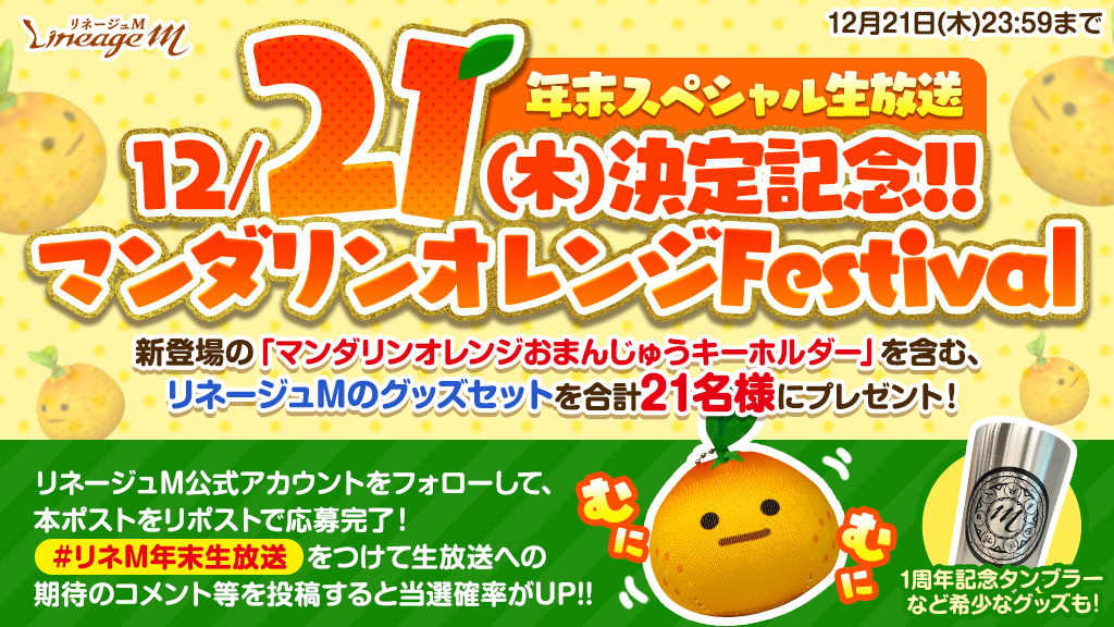 新グッズ「マンダリンオレンジおまんじゅうキーホルダー」を含む、「リネージュMグッズセット」を21名様にプレゼントする「マンダリンオレンジFestival」を開催します。