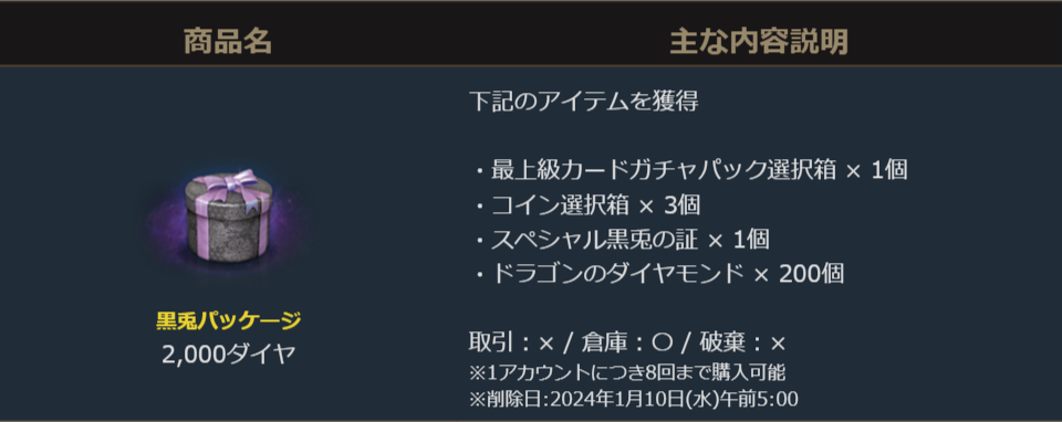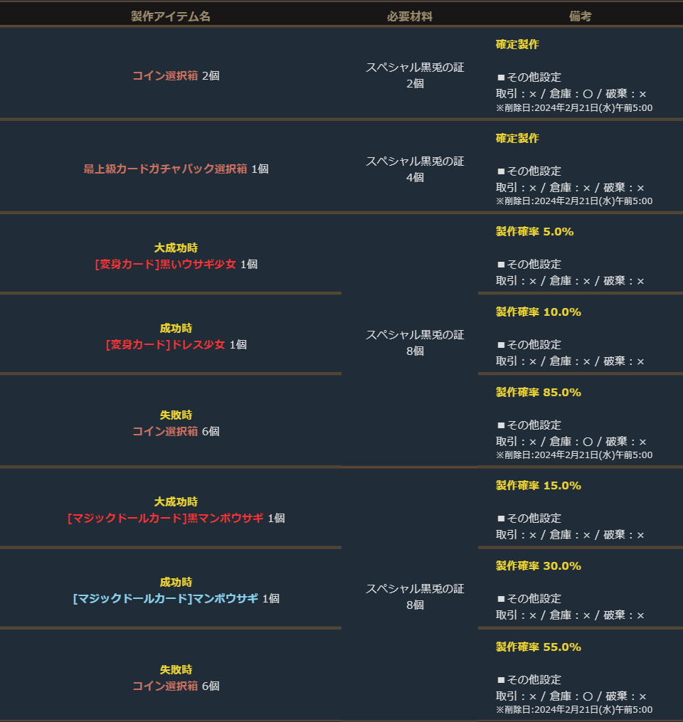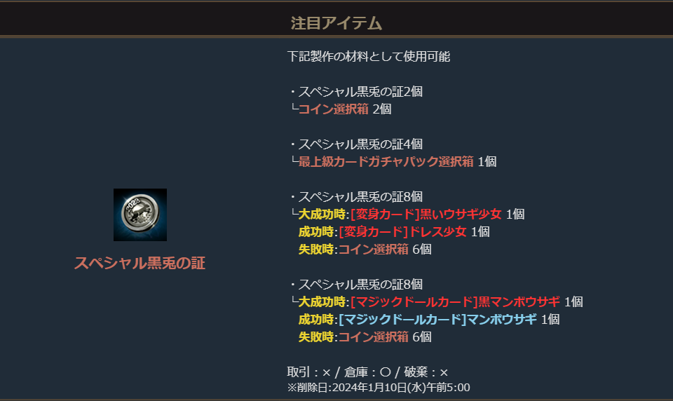 「最上級カードガチャパック選択箱1個」と「コイン選択箱3個」と「ドラゴンのダイヤモンド200個」に加え、付属の「スペシャル黒兎の証」を材料に変身カードやマジックドールカードの製作に挑戦できます。