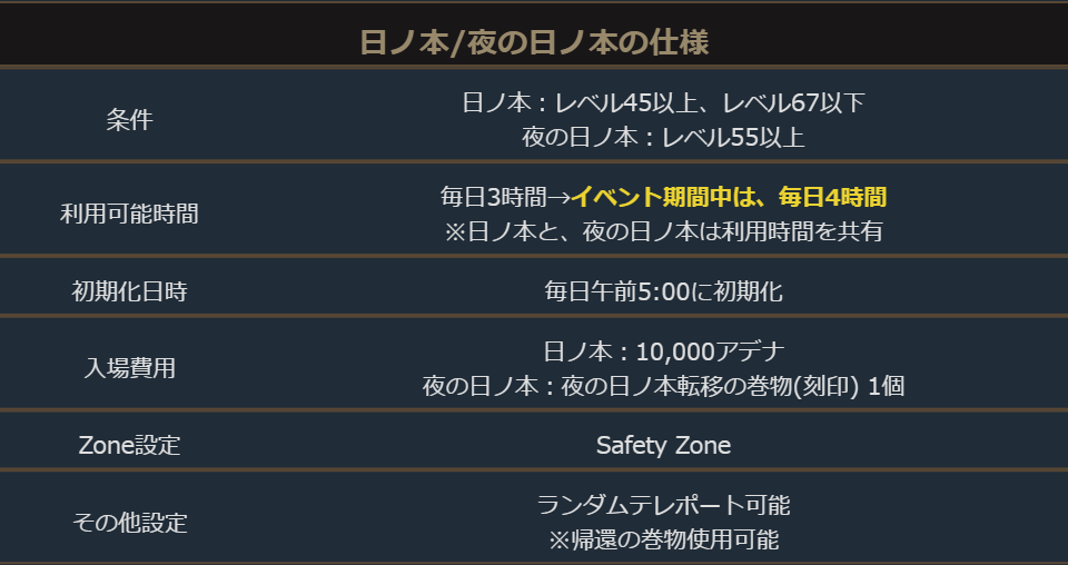 イベント期間中、特殊ダンジョン「日ノ本」と「古代巨人の墓」の利用可能時間が1時間増加します。