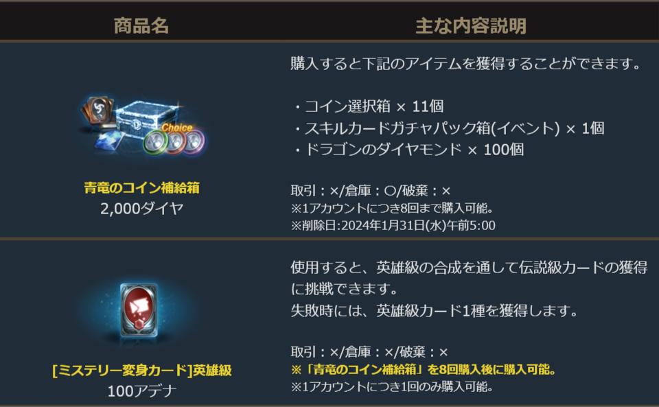 2024年1月13日土曜日0時より販売を開始致します「青竜のコイン補給箱」のご案内を申し上げます。