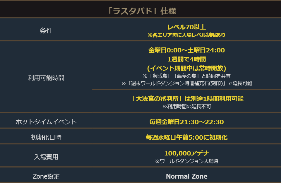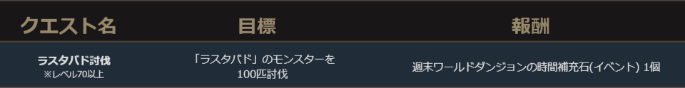 イベント期間中ワールドダンジョン「ラスタバド」が常時開放された状態となります。