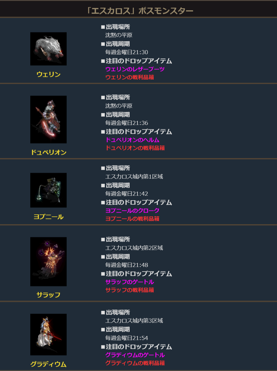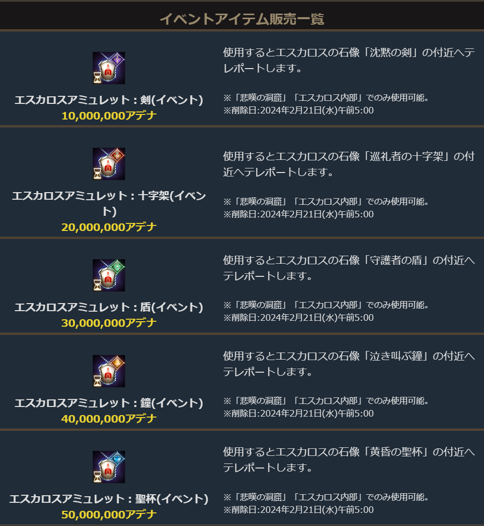 ・デス[死の商人]からは下記の各種アミュレットが購入可能となり、ワールドダンジョン「エスカロス」内での使用が可能です。