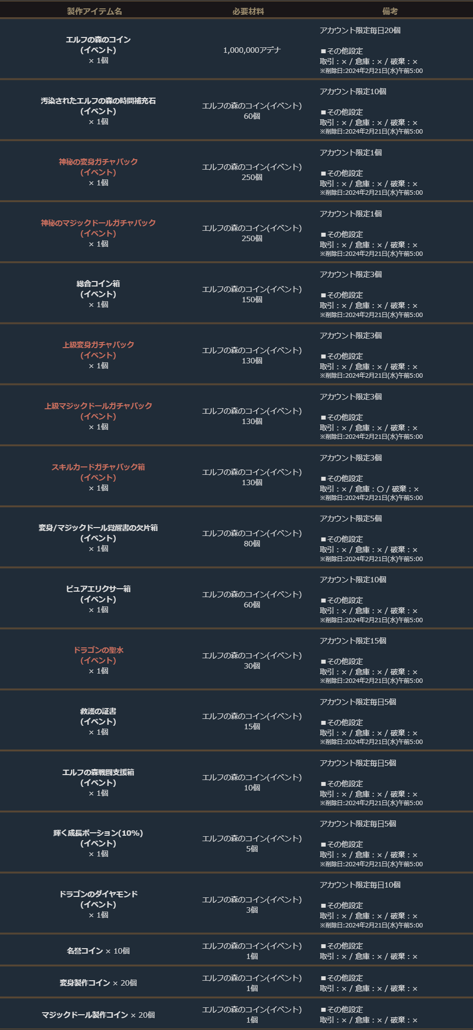 「エルフの森のコイン(イベント)」を集めてイベント専用の製作を行い、アイテムを獲得しましょう!