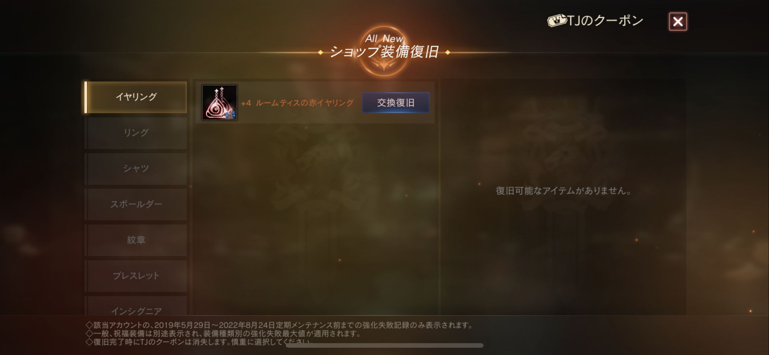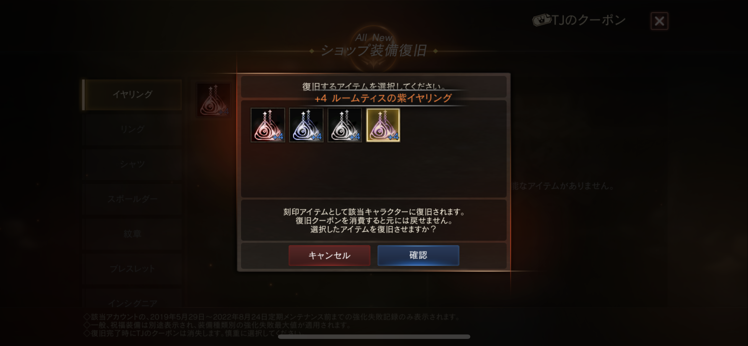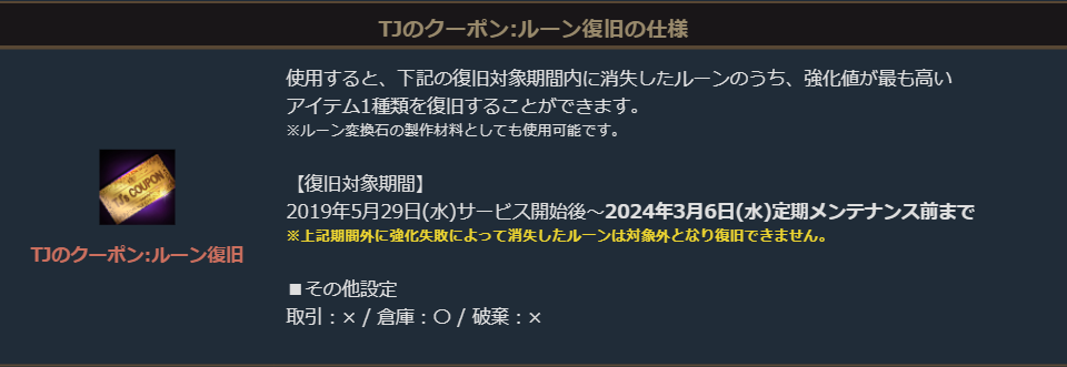 ・「TJのクーポン:ルーン復旧」を使用したキャラクターが過去に行った強化によって消失したルーンのうち、強化値が最も高いアイテム1種類を復旧することができます。