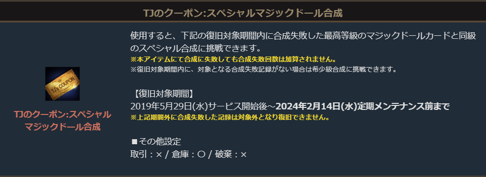 TJのクーポン:スペシャルマジックドール合成は、対象期間内に合成失敗した最高等級のマジックドールカードの合成に、成功時と失敗時の候補を選択して再挑戦できる特別なアイテムです。