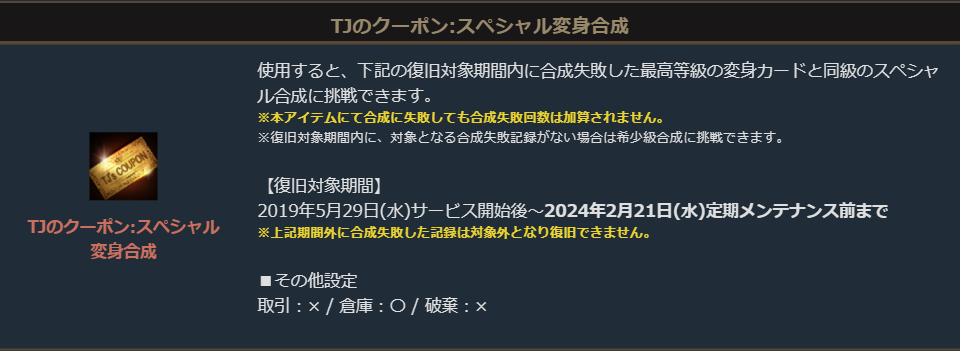 TJのクーポン:スペシャル変身合成は、対象期間内に合成失敗した最高等級の変身カードの合成に、成功時と失敗時の候補を選択して再挑戦できる特別なアイテムです。
