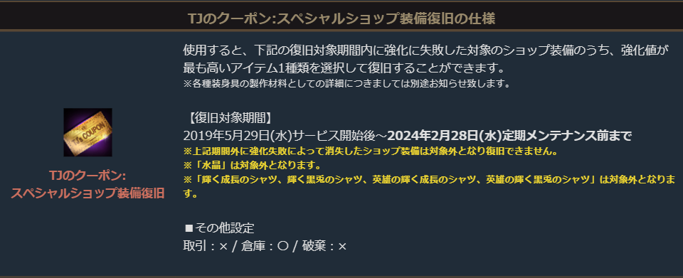 TJのクーポン:スペシャルショップ装備復旧は、対象期間内で強化失敗したショップ装備を復旧することができる特別なアイテムです。