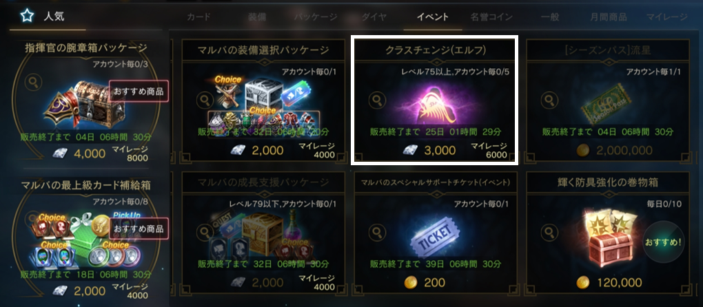 クラスチェンジは、血盟君主とクラスチェンジ先と同一の職業を除くレベル75以上のキャラクターで購入することができます。
