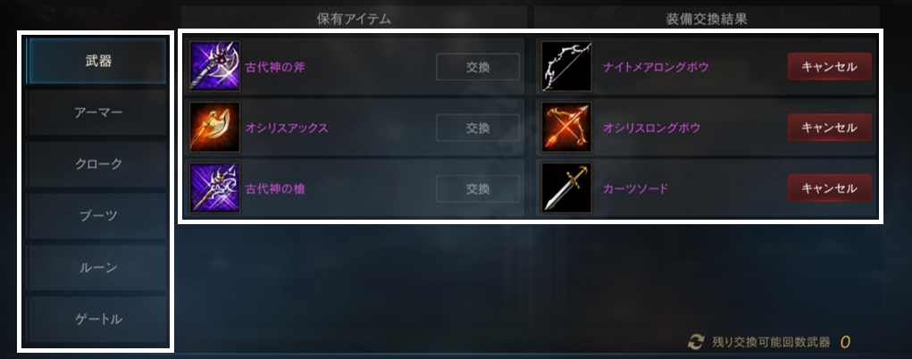 クラスチェンジを行う際に交換可能なアイテムは、希少級以上のクラスチェンジ前のキャラクターが装備可能なアイテムが対象となります。