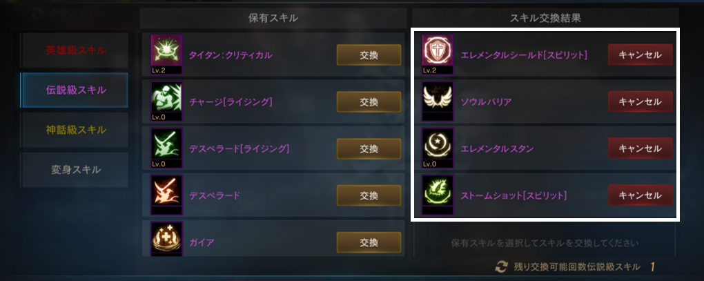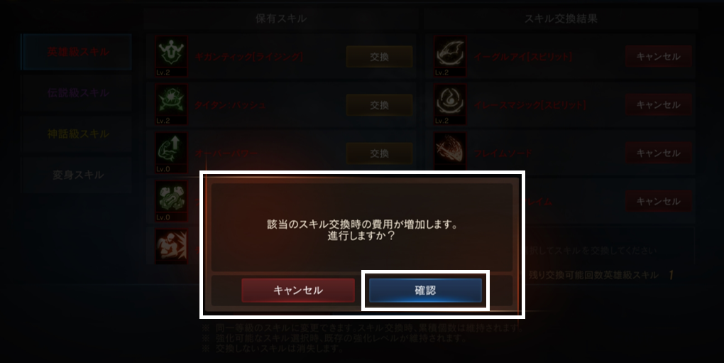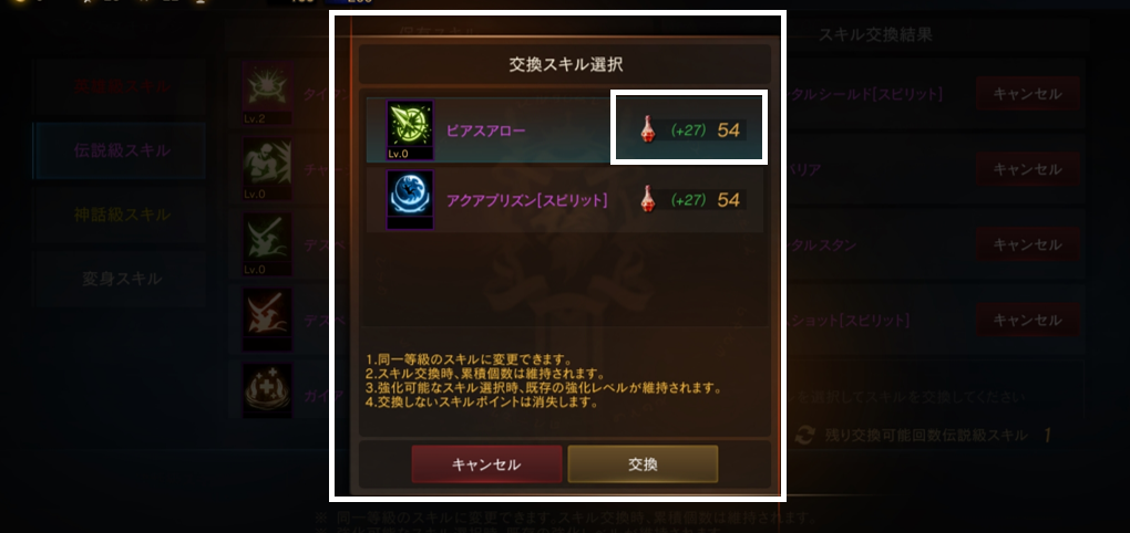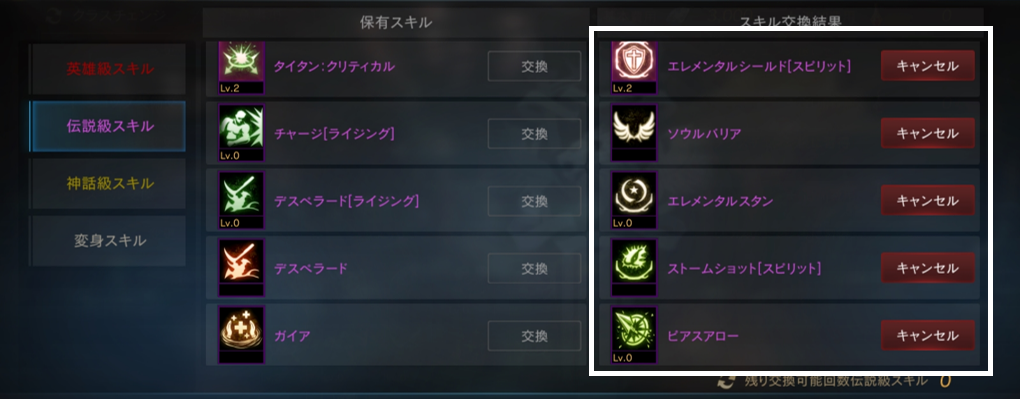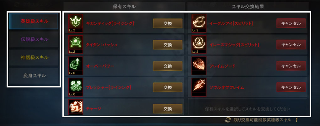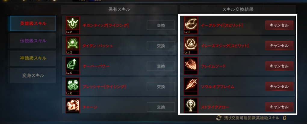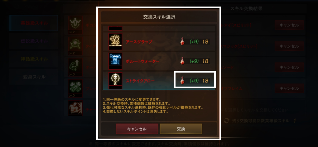 「英雄級スキル」と「伝説級スキル」は各等級ごとに最大で「5個」まで交換が可能です。
