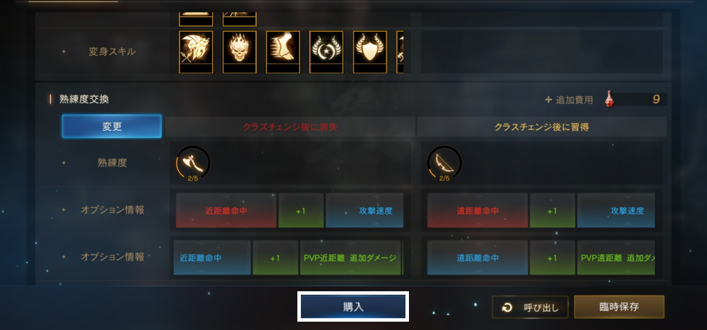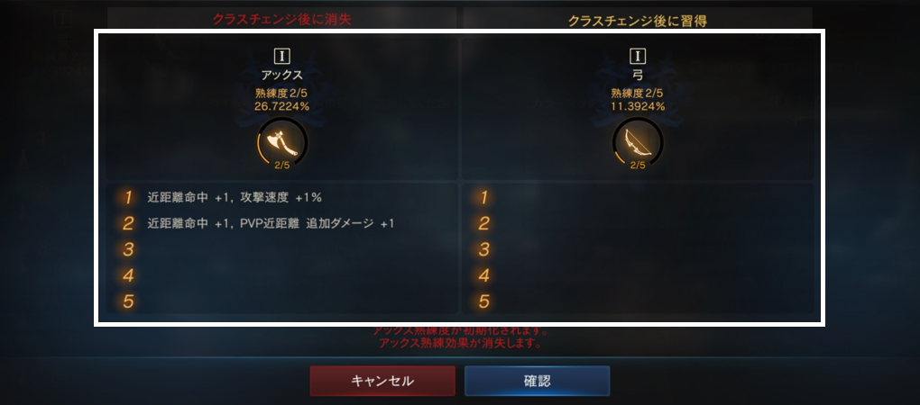 ※【スキルエンチャントで強化済み】のスキルの交換は、クラスチェンジ先の職業の【スキルエンチャントで強化が可能】なスキルに交換した場合のみ強化値が引き継がれます。