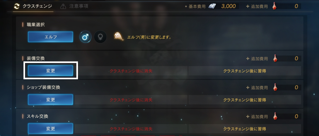 クラスチェンジを行う際、装備中のアイテムは交換することが出来ませんので安全な場所で装備を外した状態で開始してください。