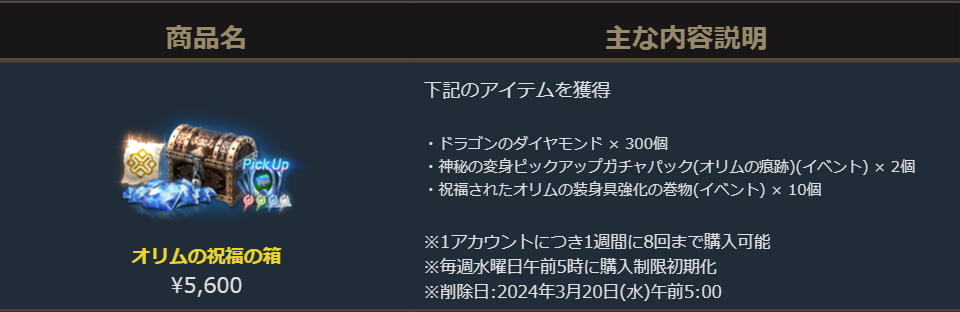 「ドラゴンのダイヤモンド300個」、「祝福されたオリムの装身具強化の巻物(イベント)10個」、「神秘の変身ピックアップガチャパック(オリムの痕跡)(イベント)2個」がセットになったパッケージです。