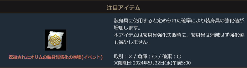 ※一部アイテムは未使用の場合、一定期間が経過すると自動で削除されます。詳しくは各アイテムの詳細をご確認ください。