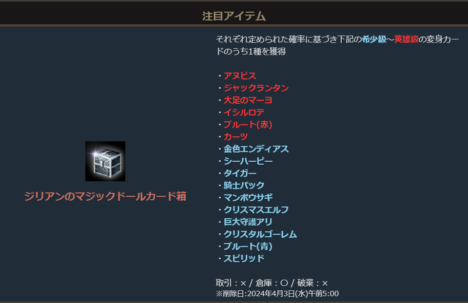 特定の希少級~英雄級マジックドールカードからなるリスト内のうち1種を獲得できる「ジリアンのマジックドールカード箱」に加え、「神秘のカードガチャパック選択箱」と「ドラゴンのダイヤモンド」が入った毎月2回まで購入可能なパッケージです。