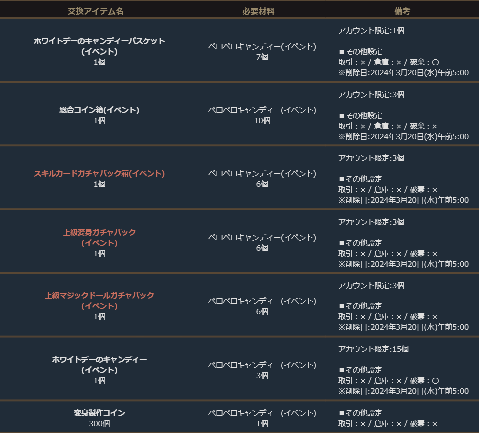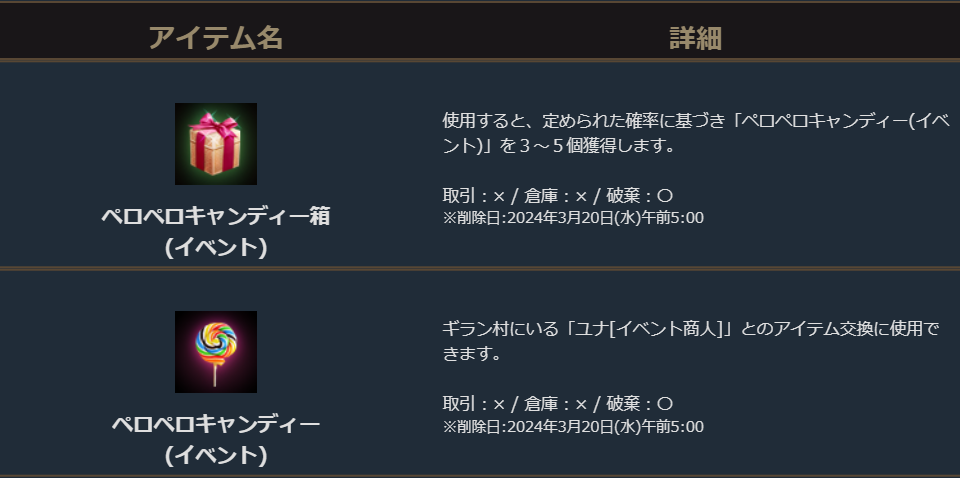 「ペロペロキャンディー(イベント)」を集める事で、イベント商人から様々な豪華アイテムと交換する事ができます!