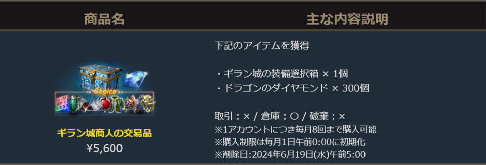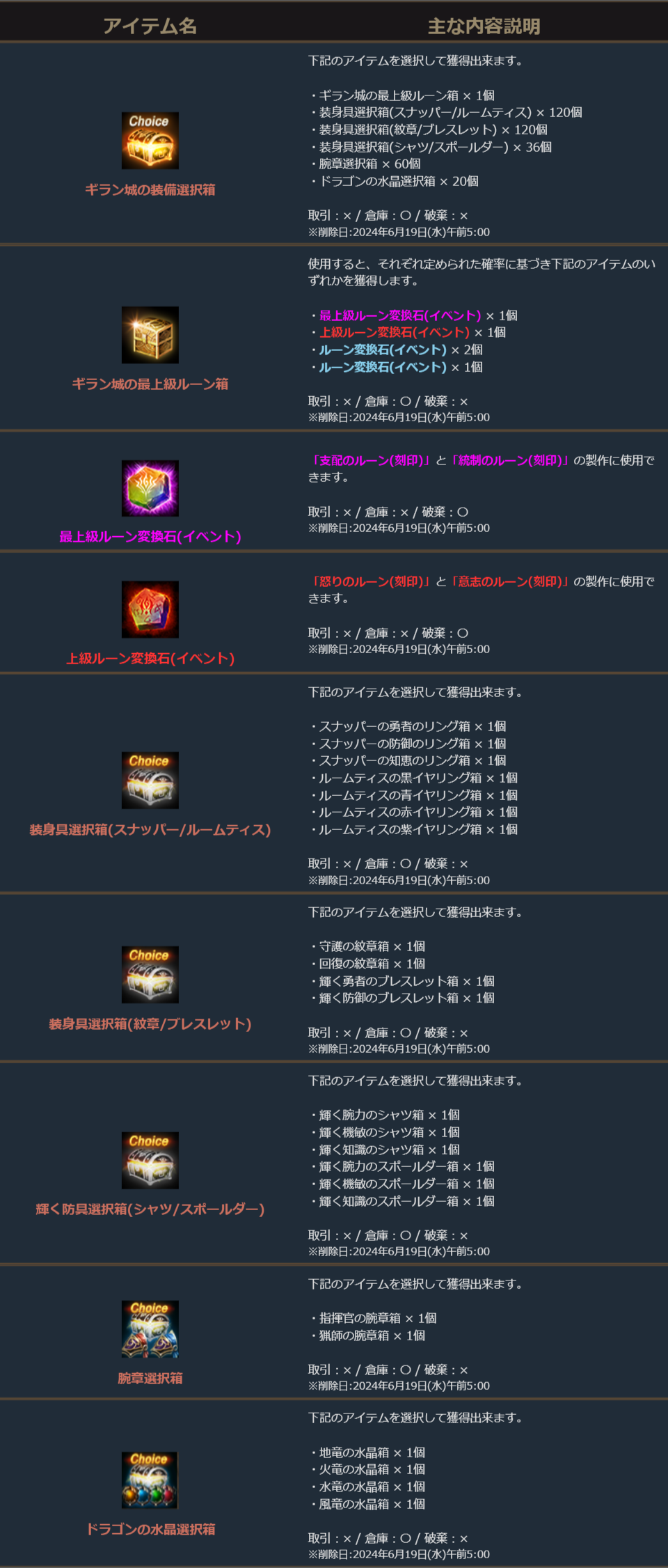 「ギラン城の装備選択箱」からは「ギラン城の最上級ルーン箱」や各種装身具選択箱などを選択して獲得でき、「ドラゴンのダイヤモンド」も手に入るパッケージです。