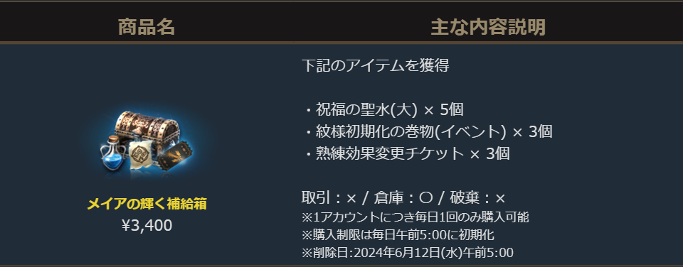 紋様の強化に使用する祝福ポイントが多く獲得できる「祝福の聖水(大)」と、強化済みの紋様をリセットし強化に使用した祝福ポイントを取り戻すことができる「紋様初期化の巻物(イベント)」に「熟練効果変更チケット」がそれぞれ複数セットになったパッケージです。