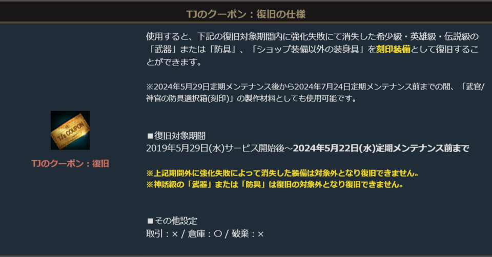 ・過去にTJクーポンで復旧を行い、その後同種/同強化のアイテムの新たな強化失敗記録がない場合そのアイテムは復旧できません。