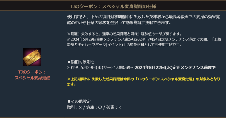 TJのクーポン:スペシャル変身覚醒は、対象期間中に失敗した英雄級から最高等級までの変身の効果覚醒の中から、任意の等級を選択して効果覚醒に挑戦できる特別なアイテムです。