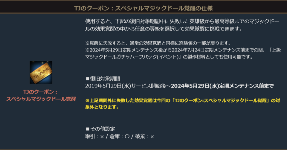 TJのクーポン:スペシャルマジックドール覚醒は、対象期間中に失敗した英雄級から最高等級までのマジックドールの効果覚醒の中から、任意の等級を選択して効果覚醒に挑戦できる特別なアイテムです。