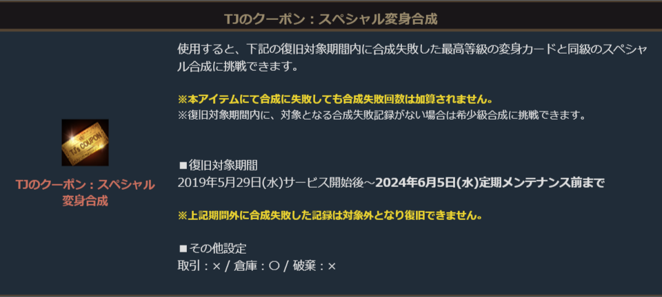 TJのクーポン:スペシャル変身合成は、対象期間内に合成失敗した最高等級の変身カードの合成に、成功時と失敗時の候補を選択して再挑戦できる特別なアイテムです。