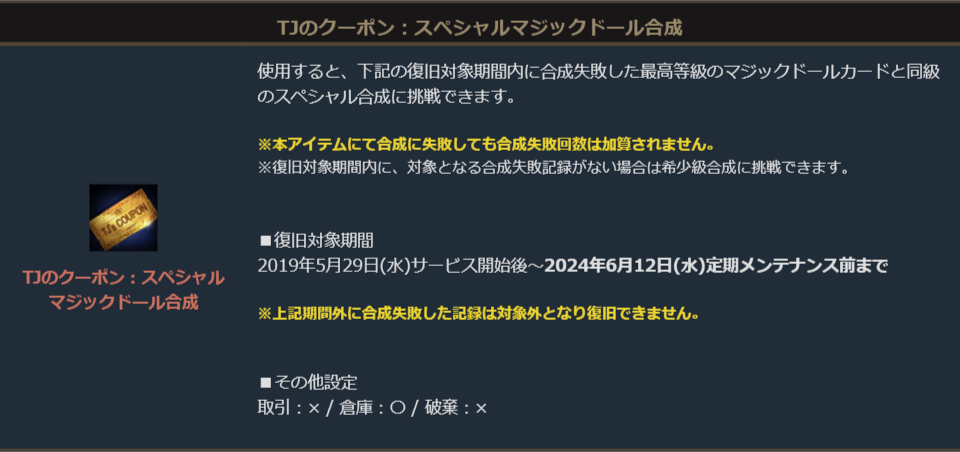 TJのクーポン:スペシャルマジックドール合成は、対象期間内に合成失敗した最高等級のマジックドールカードの合成に、成功時と失敗時の候補を選択して再挑戦できる特別なアイテムです。