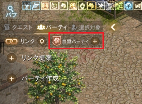 血盟に加入していると、「パーティ」タブに「血盟パーティ」の画面を表示する「+」ボタンが表示されます。