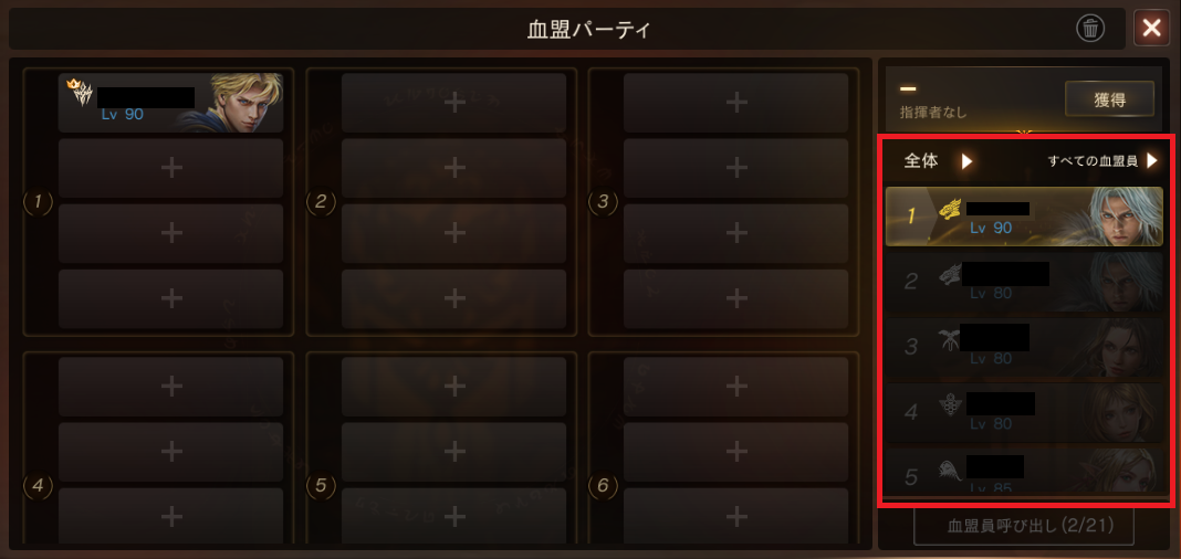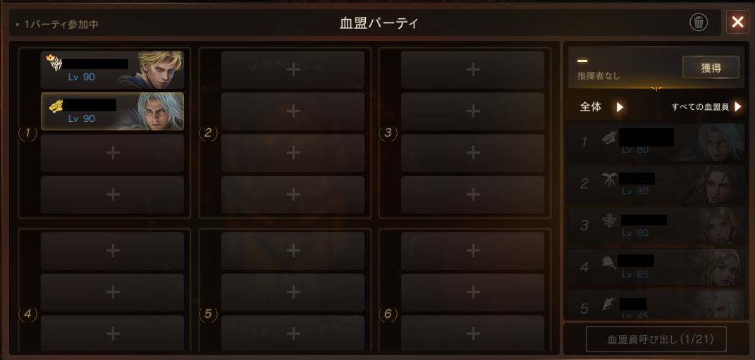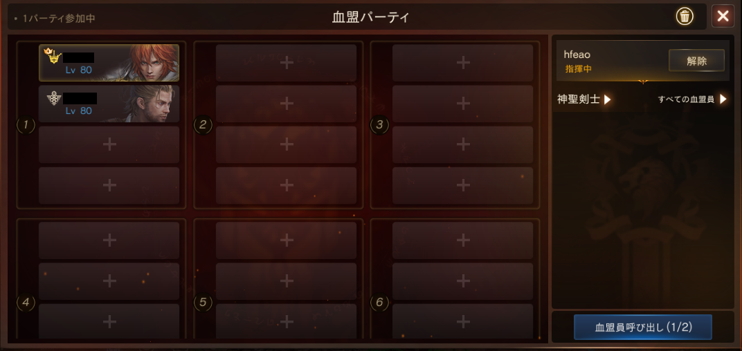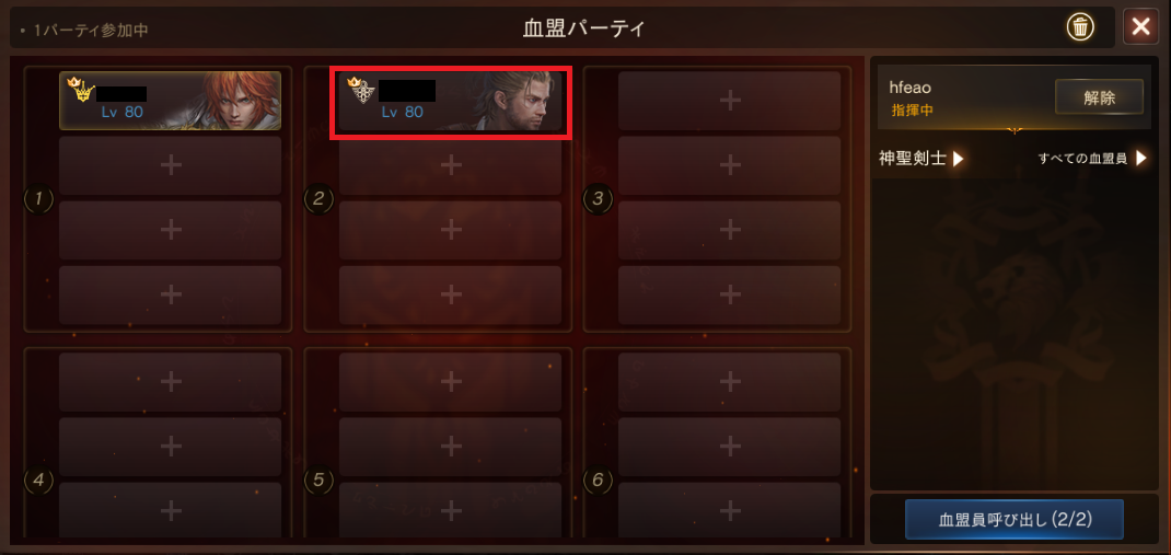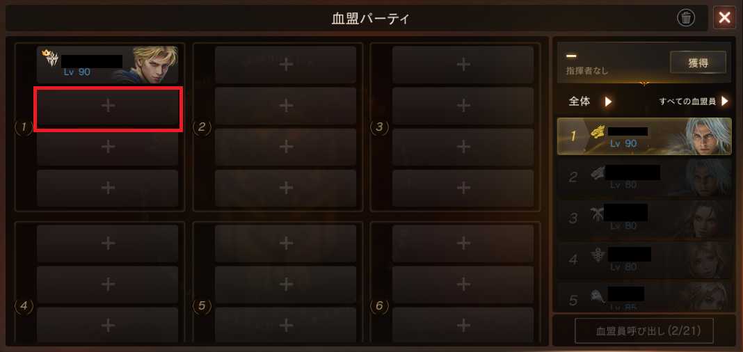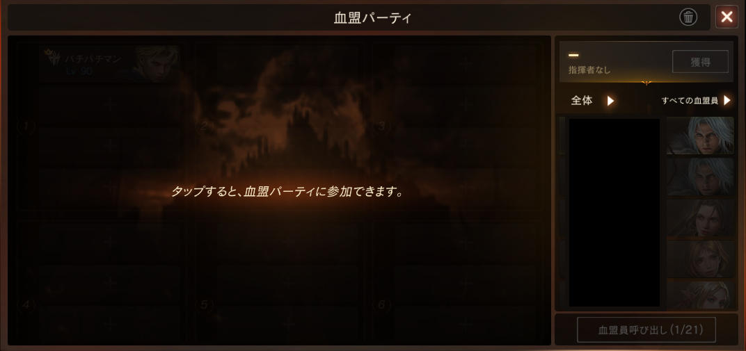 右側に自分と他の血盟員が表示されており、自分を選択してパーティ内の「+」ボタンを押すと、そのパーティに合流出来ます。