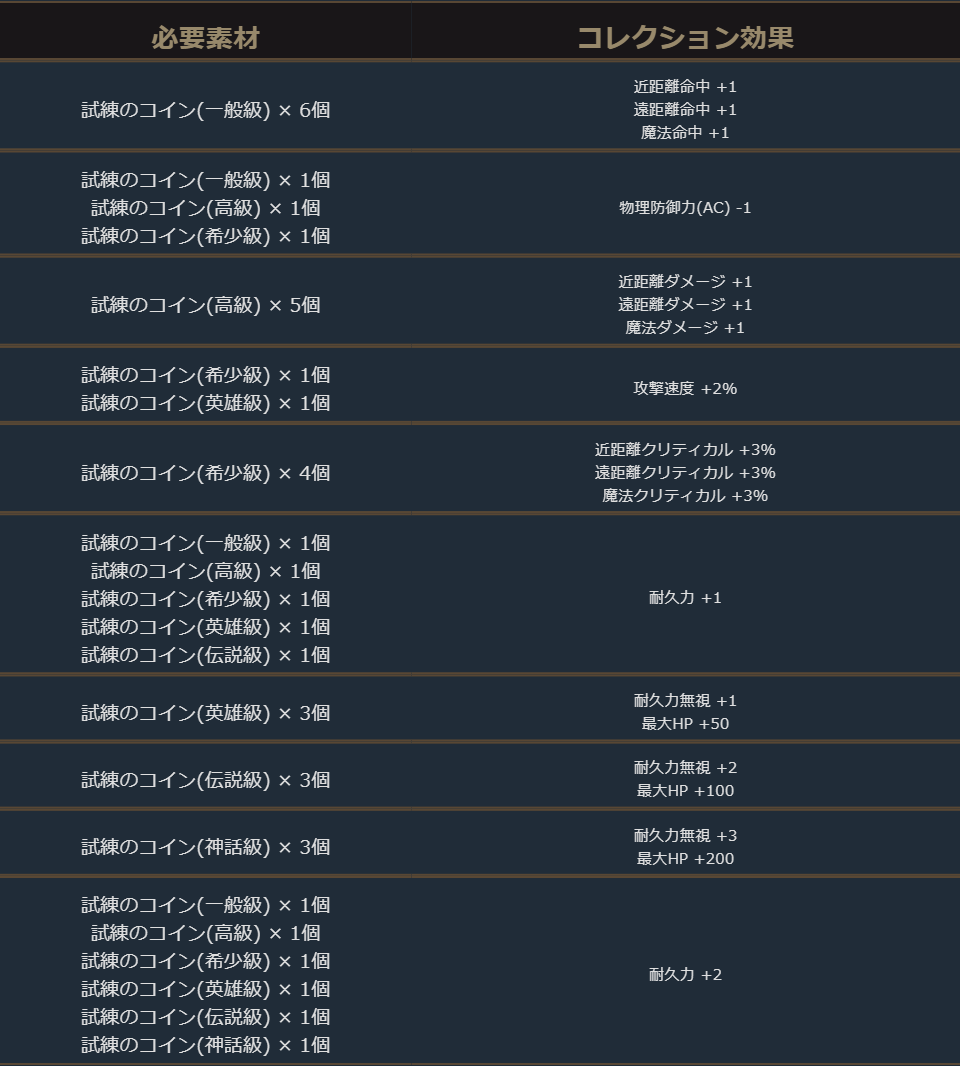試練のコインは一般級~神話級の6種類があり、変身製作コインや、1ランク上の試練のコインの製作材料、下記の新規コレクションアイテムとして使用できます。