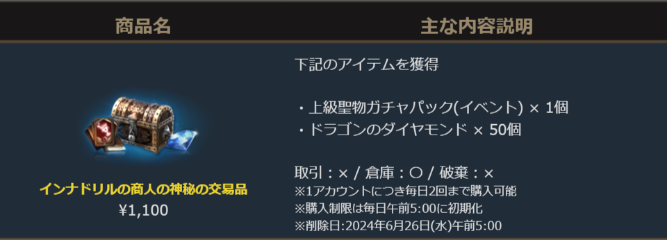 2024年5月29日より販売を開始しました「インナドリルの商人の神秘の交易品」のご案内を申し上げます。
