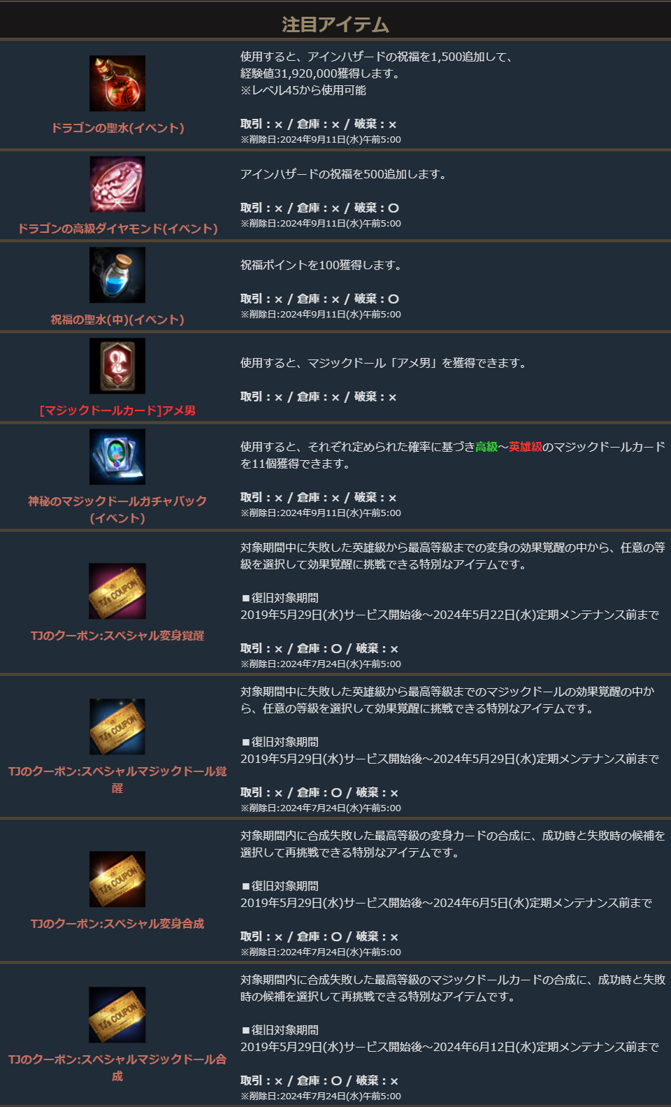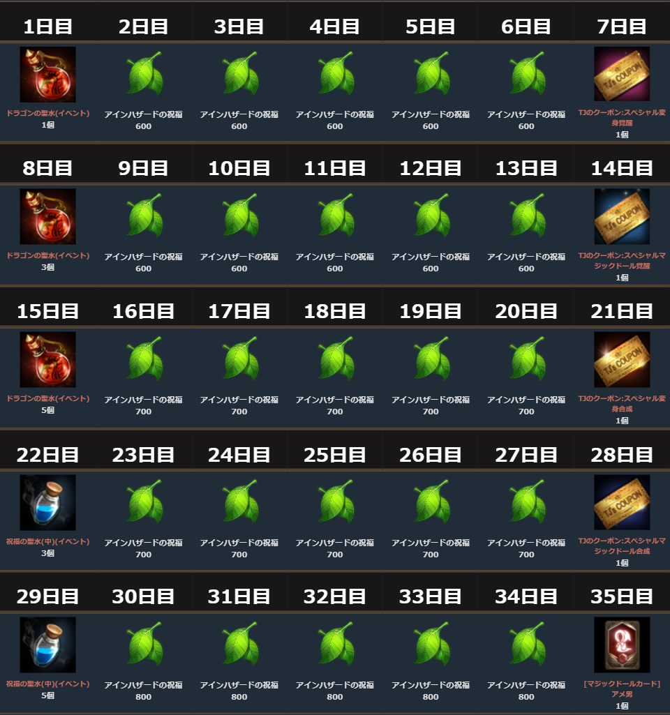 多くのアインハザードの祝福に加え、「ドラゴンの聖水(イベント)」や各種「TJクーポン」が手に入るほか、