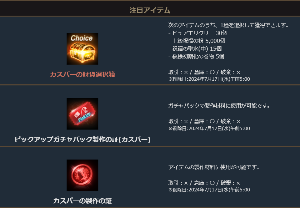 ※一部アイテムは未使用の場合、一定期間が経過すると自動で削除されます。詳しくは各アイテムの詳細をご確認ください。