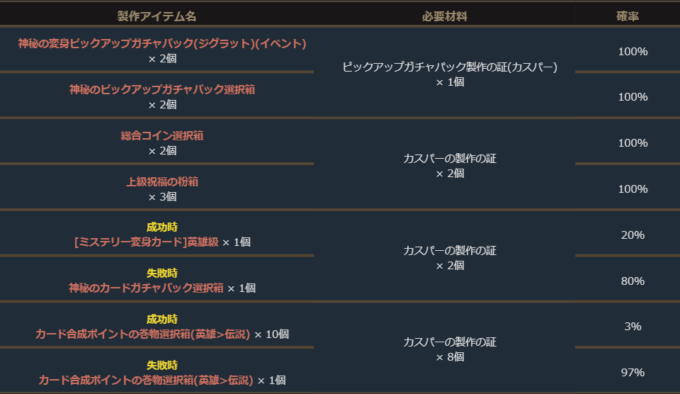 更に付属の「ピックアップガチャパック製作の証(カスパー)」では「神秘の変身ピックアップガチャパック(ジグラット)(イベント)」や「神秘のピックアップガチャパック選択箱」の製作、「カスパーの製作の証」では「[ミステリー変身カード]英雄級」などの製作にチャレンジする事ができます。