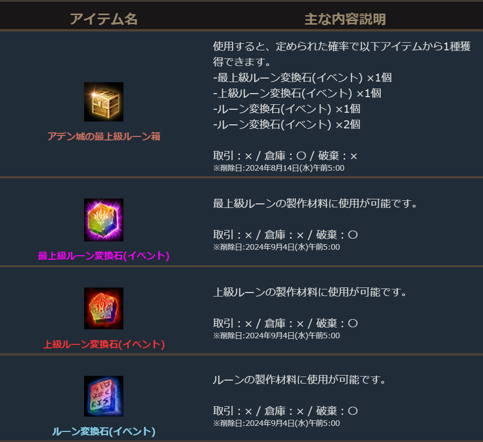 「最上級ルーン変換石(イベント)」「上級ルーン変換石(イベント)」「ルーン変換石(イベント)」から定められた確率で一つ手に入る「アデン城の最上級ルーンボックス」と「ドラゴンのダイヤモンド」300個がセットになったパッケージです。