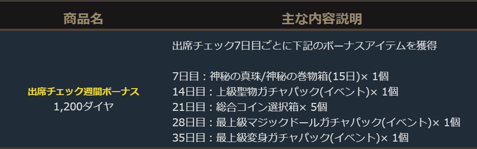 7日目ごとに追加報酬を獲得できる「出席チェック週間ボーナス」販売中!