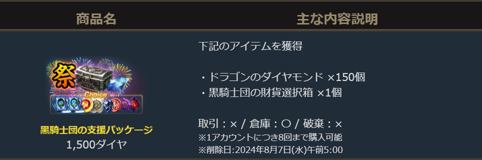 「ドラゴンのダイヤモンド」150個と「黒騎士団の財貨選択箱」1個がセットになった1アカウント8回まで購入可能なパッケージです。
