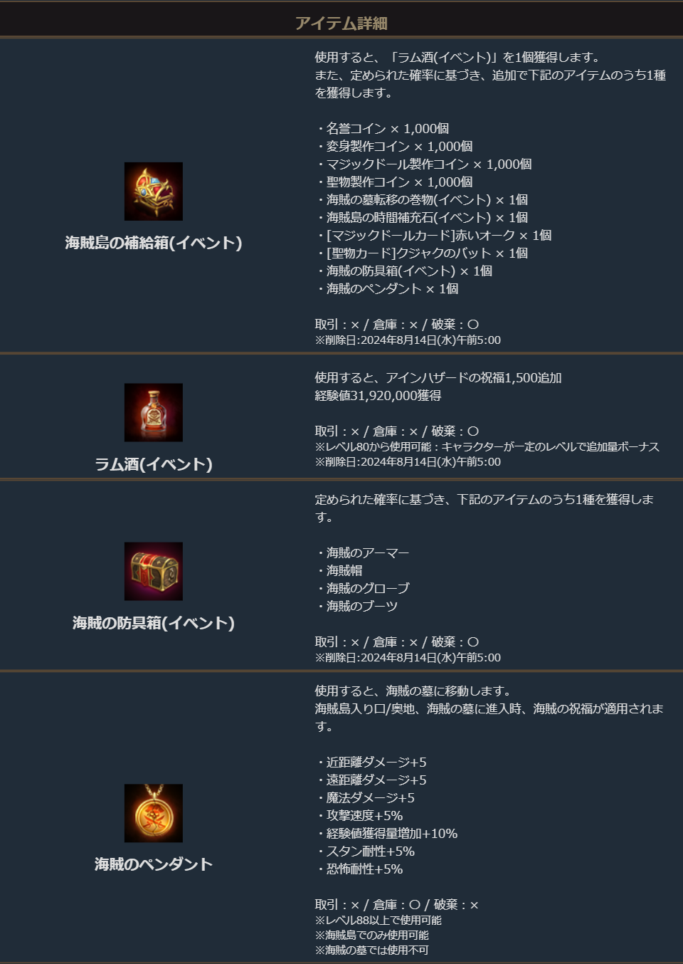 イベントクエスト報酬の「海賊島補給箱(イベント)」からは各種コインや海賊島の時間補充石(イベント)など様々なアイテムを獲得することができます。